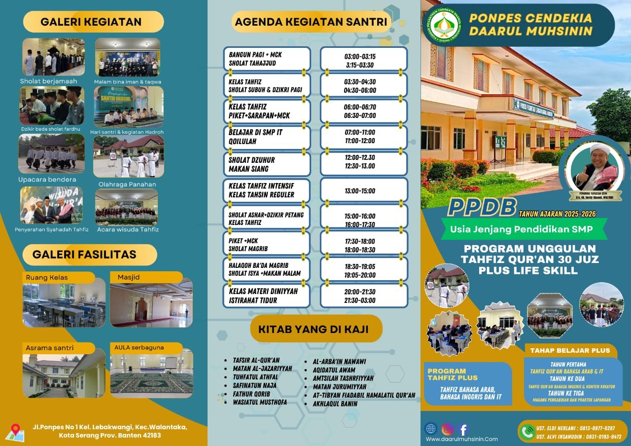 SAREKAT – SERANG, Pondok Pesantren Cendekia Daarul Muhsinin secara resmi membuka Penerimaan Peserta Didik Baru (PPDB) untuk Tahun Ajaran 2025/2026. Pendaftaran ini ditujukan bagi siswa usia jenjang pendidikan SMP dengan program unggulan Tahfiz Qur’an 30 Juz yang dipadukan dengan pembelajaran life skill.